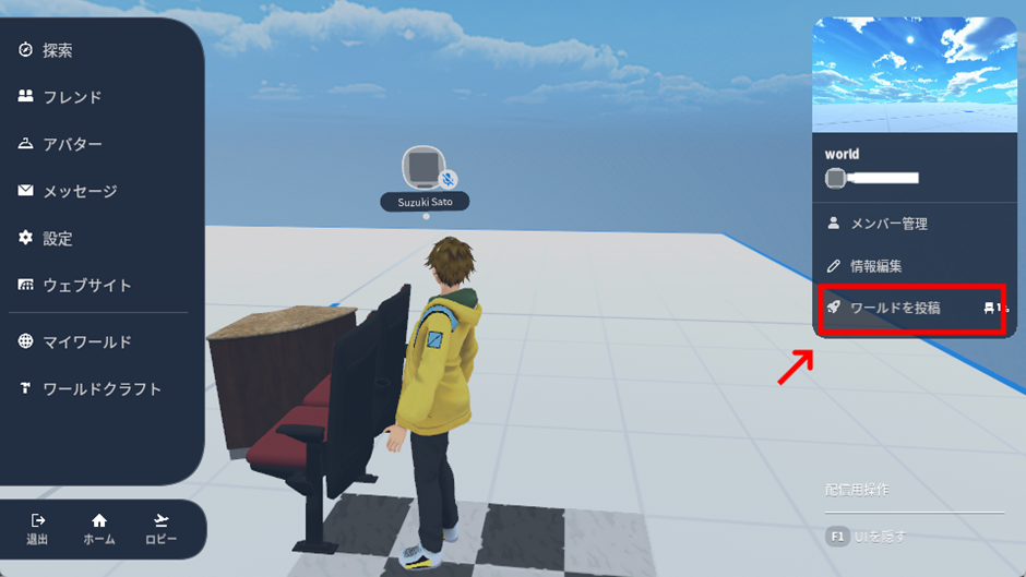 メニュー画面をクリックすると、右側にアカウントウィンドウが表示されます。そこから「ワールドを投稿」をクリックして下さい。