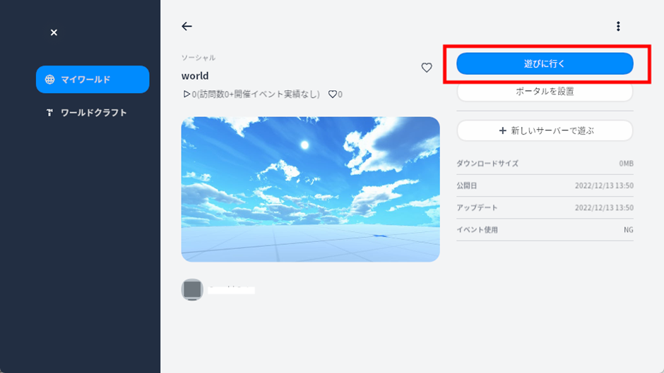 マイワールドから自分の作ったワールドを選択します。次に「遊びに行く」をクリックして下さい。自分の作ったワールドに入ることができます。