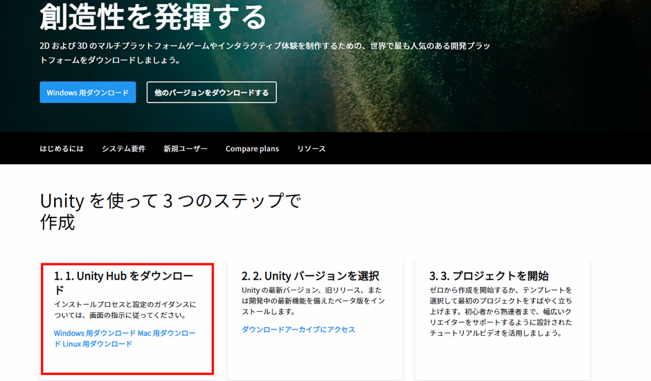 Unity公式サイト:https://unity.com/ja/download
