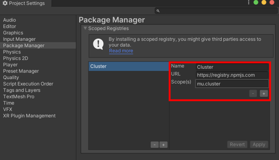 UnityメニューからEdit⇒Project Settingsを選択します。Pacage ManagerからScoped Registriesを立ち上げ、レジストリの追加をして下さい。設定は以下の通りです。