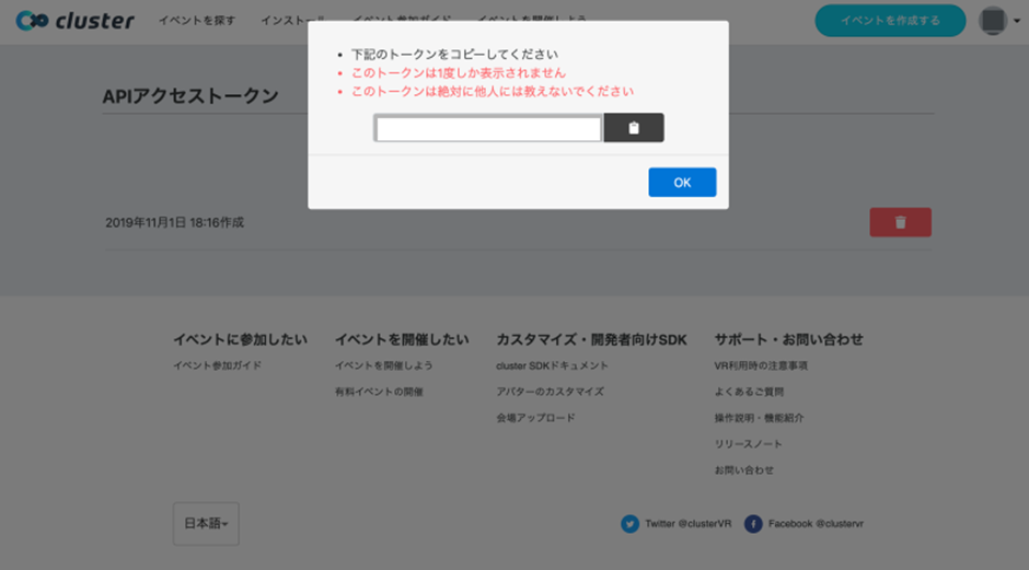 Unityからワールドをアップロードするために、公式サイトからAPIアクセストークンを入手する必要があります。あらかじめ、clusterへログインをしておきましょう。